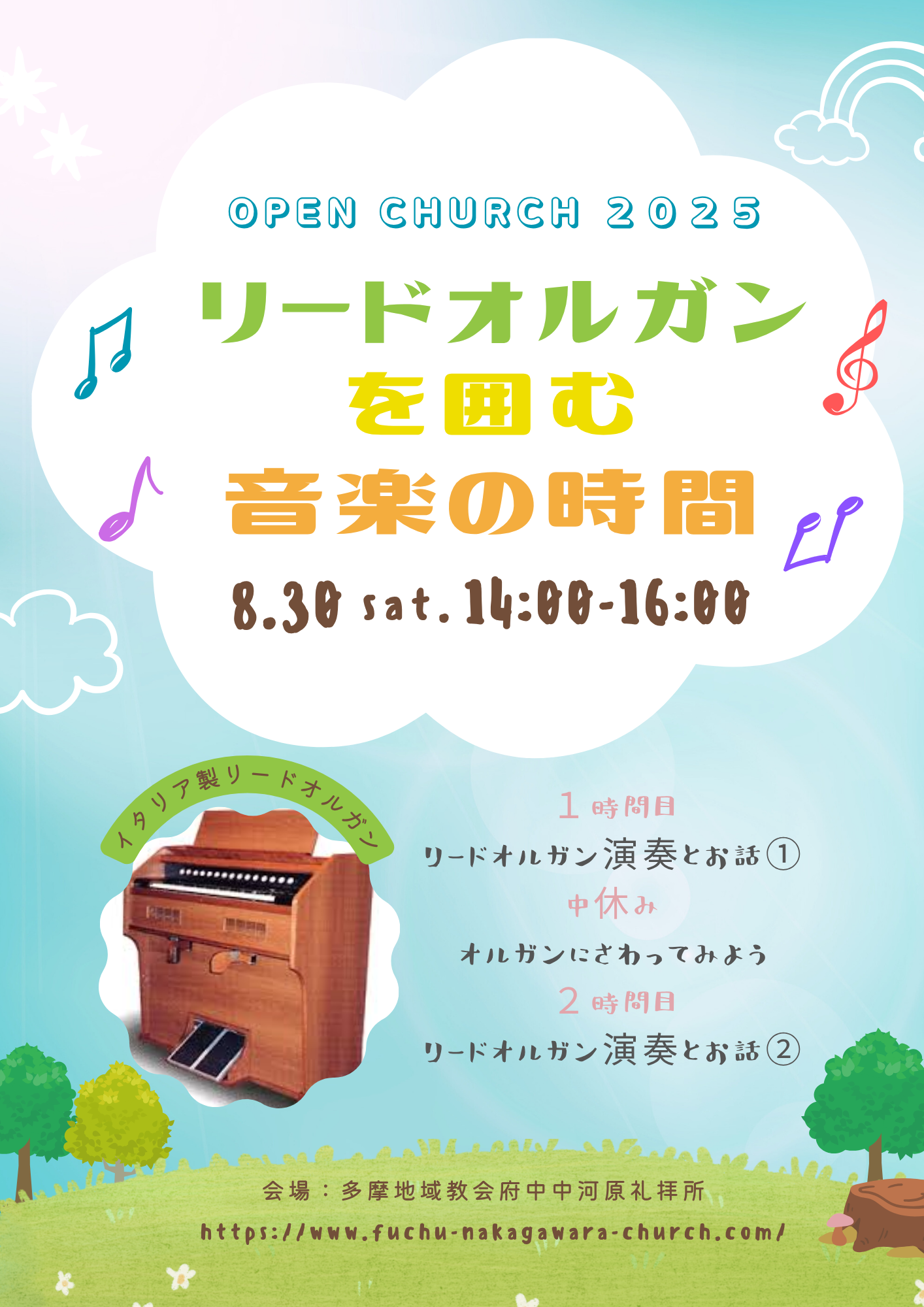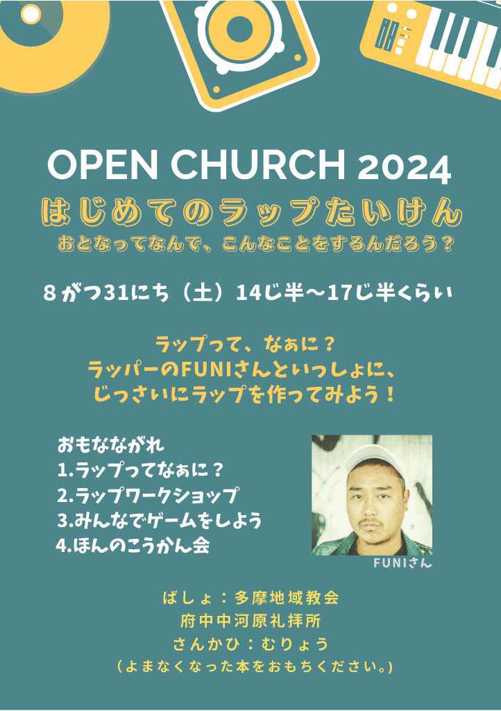 2024年8月31日(土)14時半から、府中中河原礼拝所で「オープンチャーチ2025」を行います。