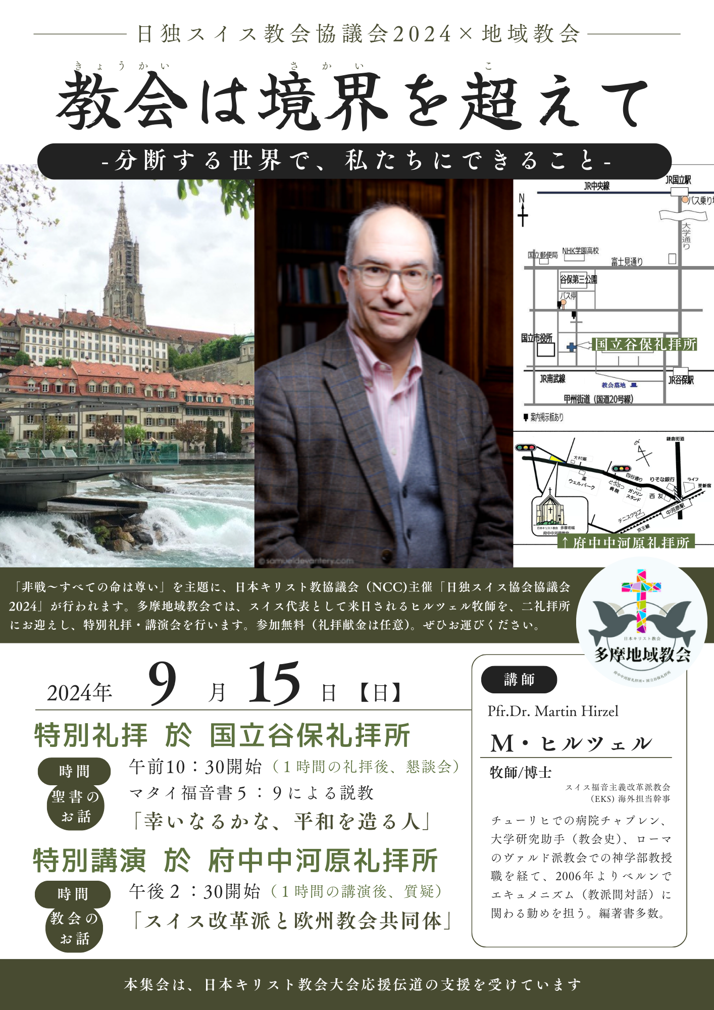 2024年9月15日(日)の礼拝は、スイスとドイツよりのゲストを迎え、国立谷保礼拝所での合同礼拝・特別伝道礼拝を行いました。また、14時半より、今度は府中中河原礼拝所を会場に、特別講演会を開催しました。