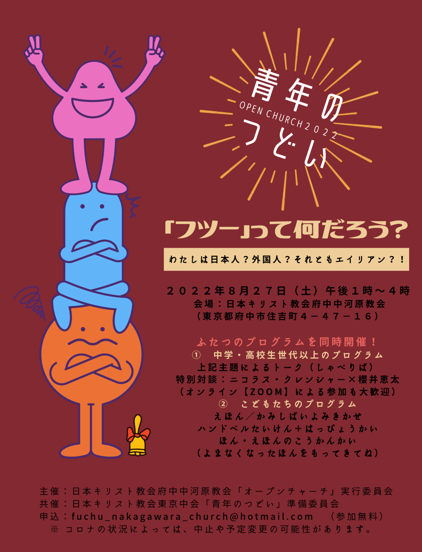 オープンチャーチ2022についてお知らせ:コロナ感染者数の増加にともない、オープンチャーチ2022のこどもプログラムは、残念ながら中止とさせていただきます。中・高校生の世代以上、青年たちを中心とした対談プログラムは、会場対面とオンライン(ZOOM)によって開催します。参加をご希望くださる方は、本ホームページの「お問い合わせ」をとおしてご連絡ください。