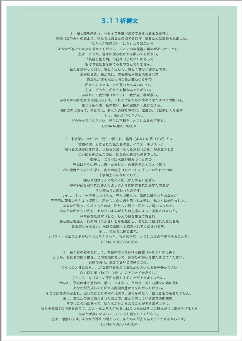 (3月6日現在)受難節のオンライン祈祷会では、「3.11を覚え、コロナ禍に祈る」と題して、東日本大震災10年を記念し、感染症も含めた災禍に向き合い、聖書に学び、共に祈るひとときを持っています。とくに「エピデミックの詩篇」とも言われる詩篇91を読みます。