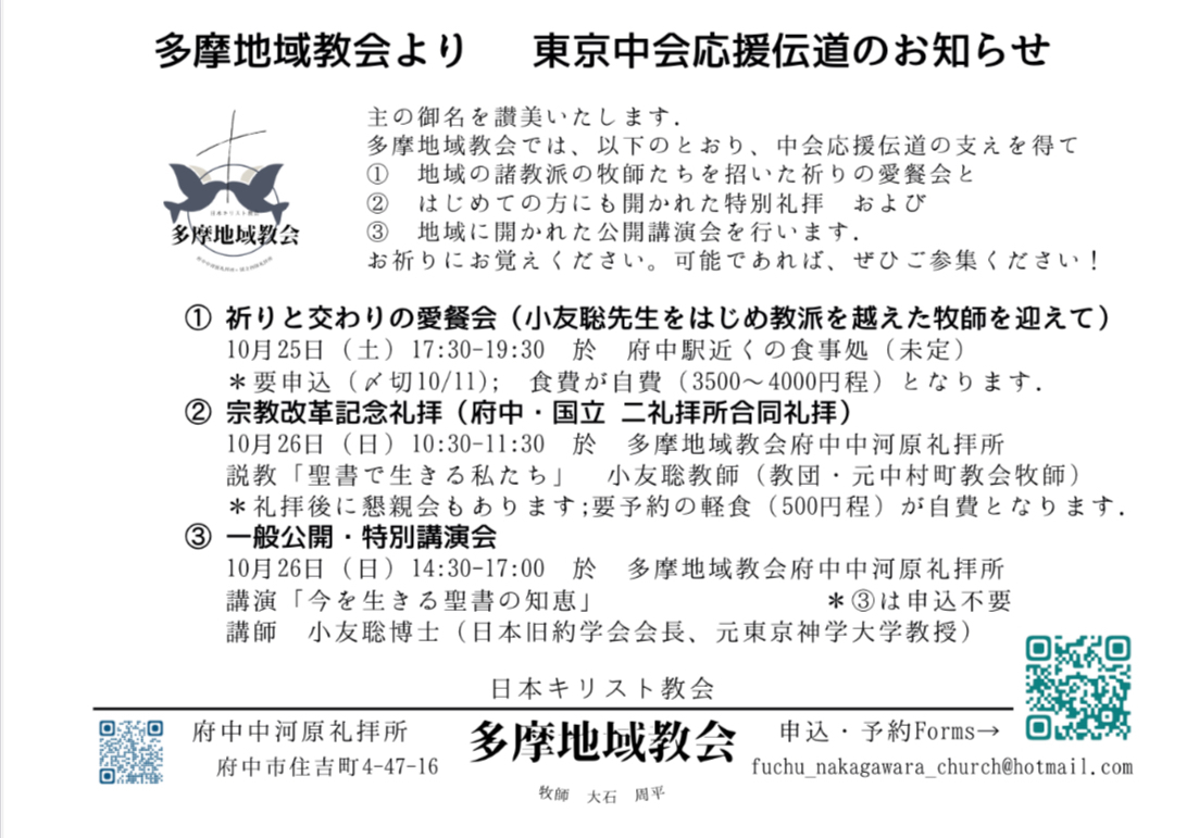 ※ 下記までは、「府中中河原教会」としてのご案内でした。上記より、「多摩地域教会」としてのお知らせをいたします。